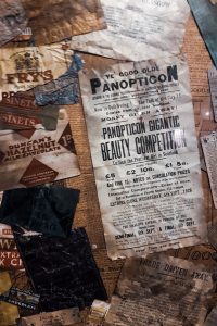 The spoils of this rediscovery are a treasure trove of goodies, a time capsule of social history running almost a century. Gloves were found on seats and discarded cigarette boxes, leaflets and more than a few trouser buttons (with their own salubrious stories to tell!) were unearthed from below floorboards. Two large original signs dominate the stage area, advertising for new talent and a 2.30pm opening. Just behind them you can also see graffiti from across the years, etched into the walls. Whilst not all strictly “ghost signs”, the collection of found and donated posters and leaflets, advertising everything from dancing ladies to comedy acts, are a fabulous means of weaving together the stories the music hall has to tell.