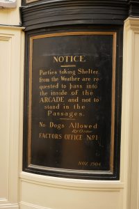 As is tradition I dipped in out of the rain on a soggy Tuesday, this time keeping my eyes peeled for ghost signs rather than jewellery. At the Buchanan Street entrance, a beautiful plaque lists the opening date of the building. This entrance is also covered by a fantastically ornate gold mosaic sign, noted as a “paired mosaic, semi-domed tympanum” in the Grade A listing. Glorious marble signage identifies the internal entrances to the Argyll Chambers (the offices above) and to Sloans restaurant. At the Argyle Street entrance an original sign, dated 1904, has been maintained across the years, reminding us that nipping into the arcade to keep out of the rain is no new thing! Very little has changed in the arcade across the years and the preservation of these glorious signs is a treat for those seeking some shelter on their ghost sign hunting travels.