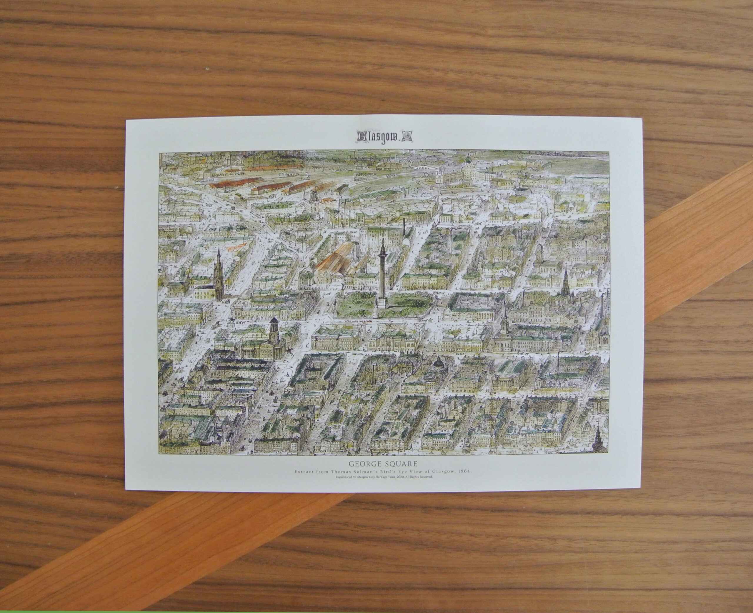 A detailed reproduction print showing an extract from Thomas Sulman’s Bird’s Eye View of the City of Glasgow published in 1864 as a supplement to The Illustrated London News. This example was expertly hand coloured. Reproduced from Glasgow City Heritage Trust’s original copy of the map and digitally restored. Printed on high quality 170gsm uncoated paper.