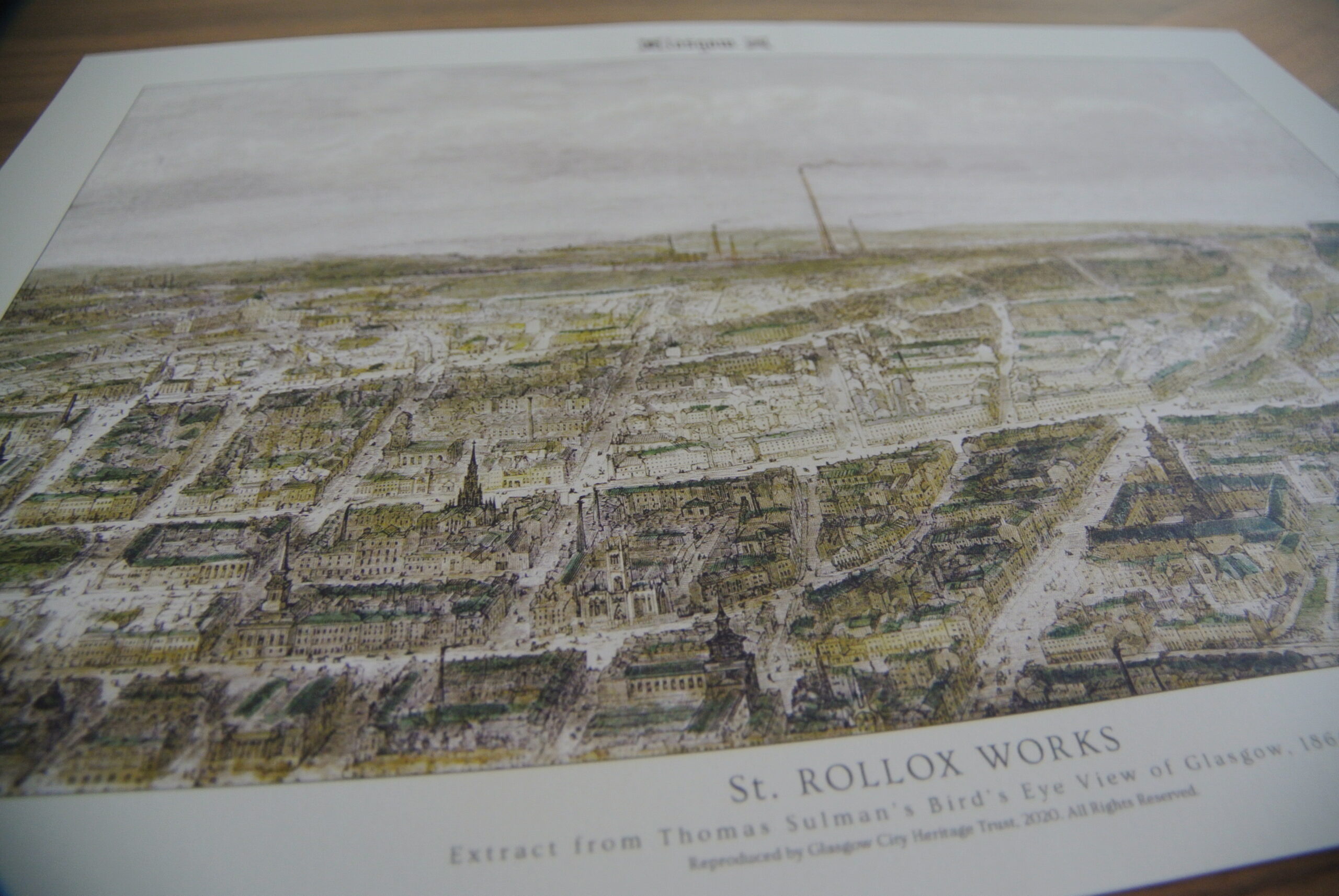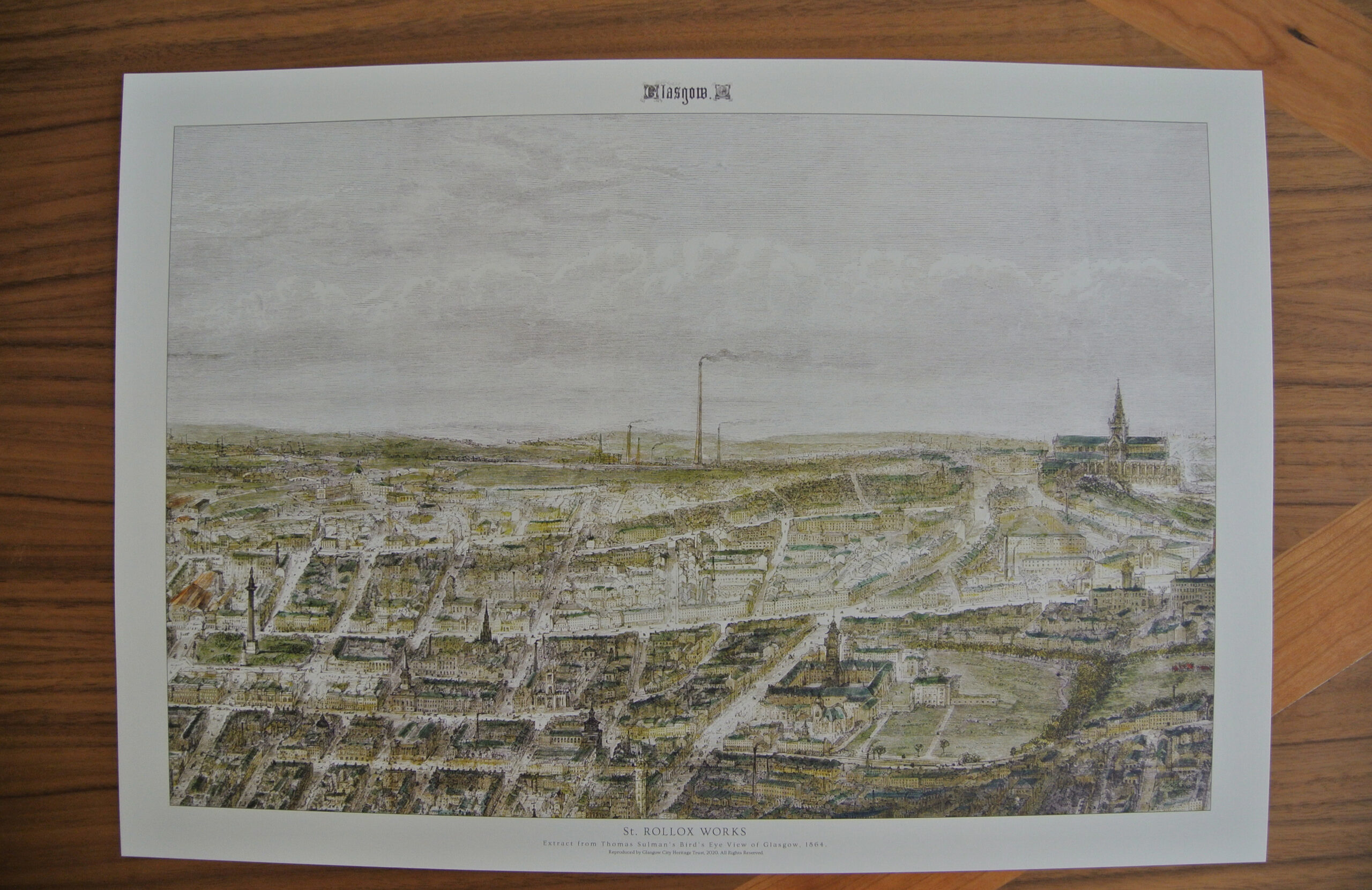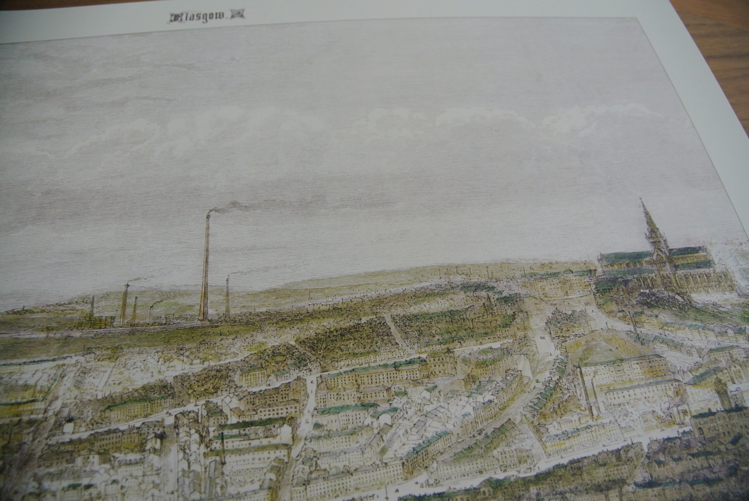 A detailed reproduction print showing an extract from Thomas Sulman’s Bird’s Eye View of the City of Glasgow published in 1864