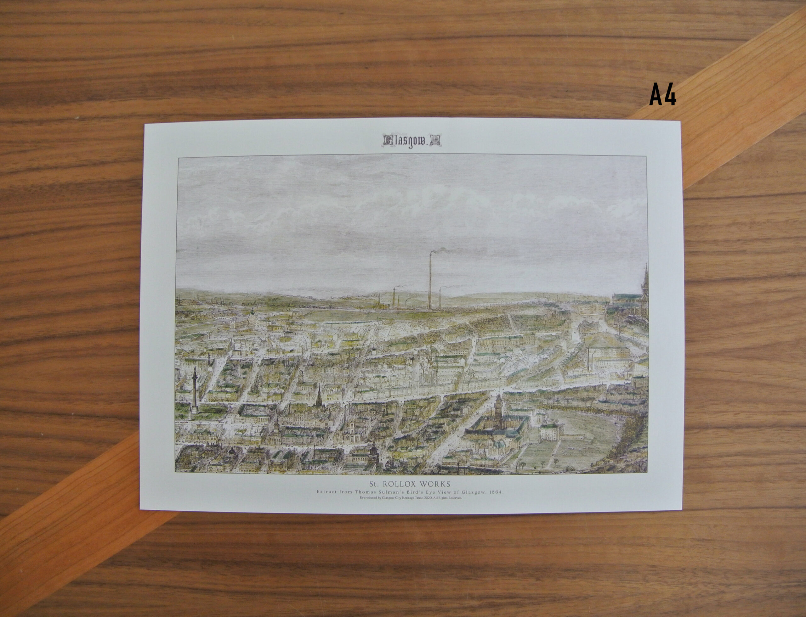A detailed reproduction print showing an extract from Thomas Sulman’s Bird’s Eye View of the City of Glasgow published in 1864 as a supplement to The Illustrated London News. This example was expertly hand coloured. Reproduced from Glasgow City Heritage Trust’s original copy of the map and digitally restored. Printed on high quality 170gsm uncoated paper.